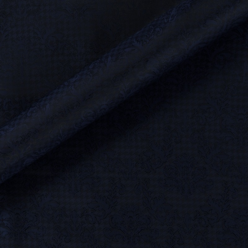 Lining in 100% Cupro Bemberg, Brunello. Dyed in Prussian blue yarn, with floral design, for a jacket that mixes heritage and artistic flair.