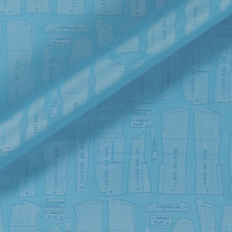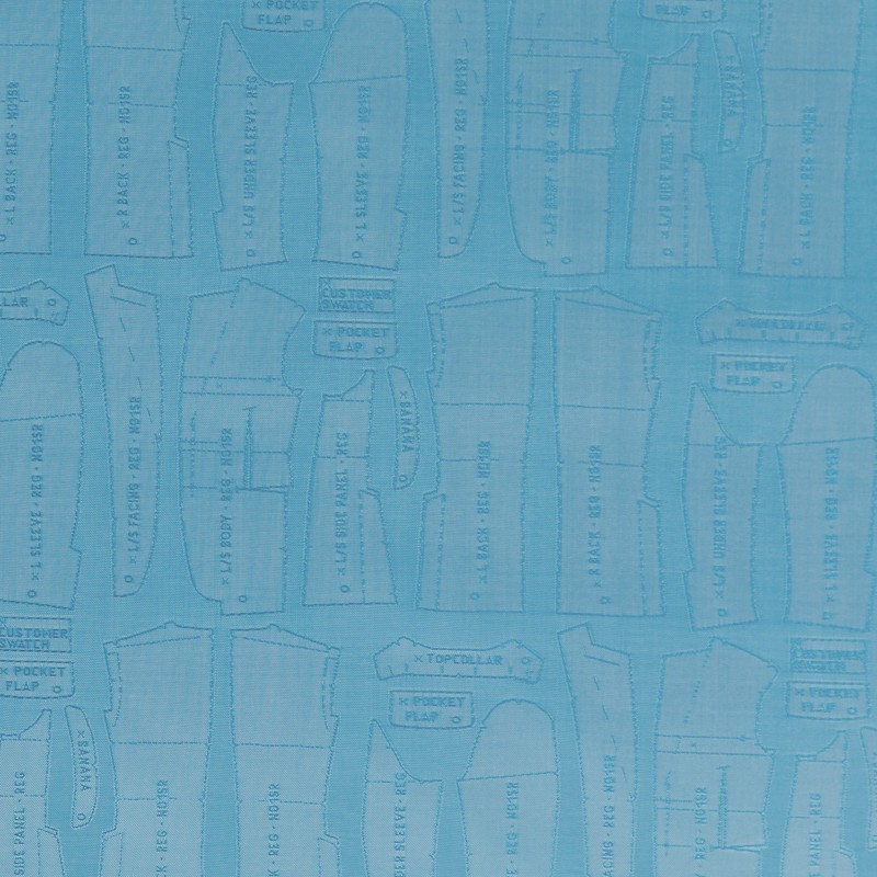 Lining in 100% Cupro Bemberg, Brunello. Dyed in turquoise yarn, which takes up the design of a pattern, for a jacket that interprets the classic with irony.