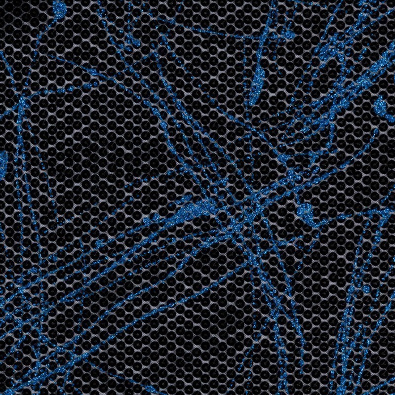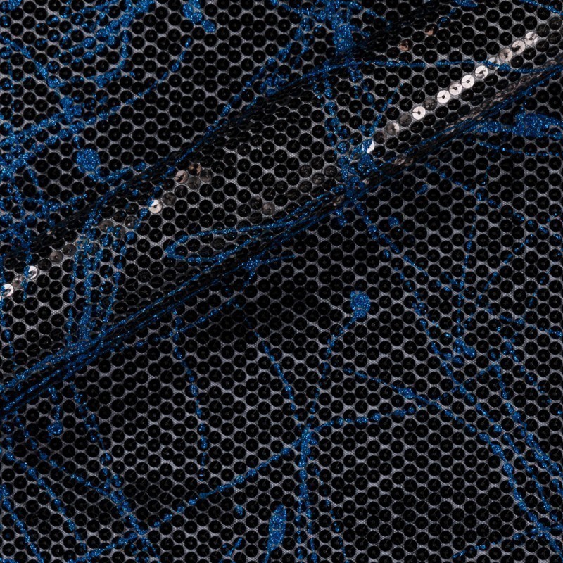 Black tulle fabric, with pailletes embroidery and blu glitter details Collection SS24, for a bold and sensual garment.