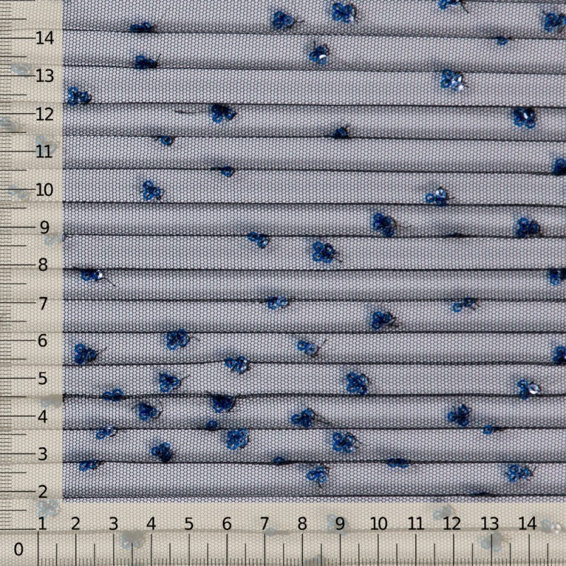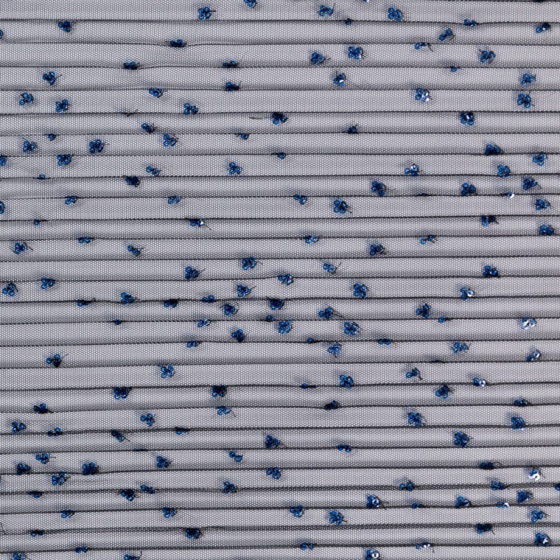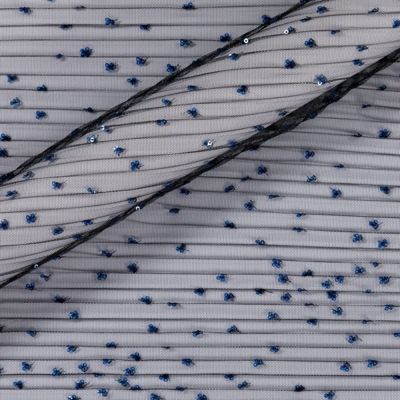 Black pleated tulle fabric with blu pailletes embroidery Collection SS24, for a bold and sensual garment.