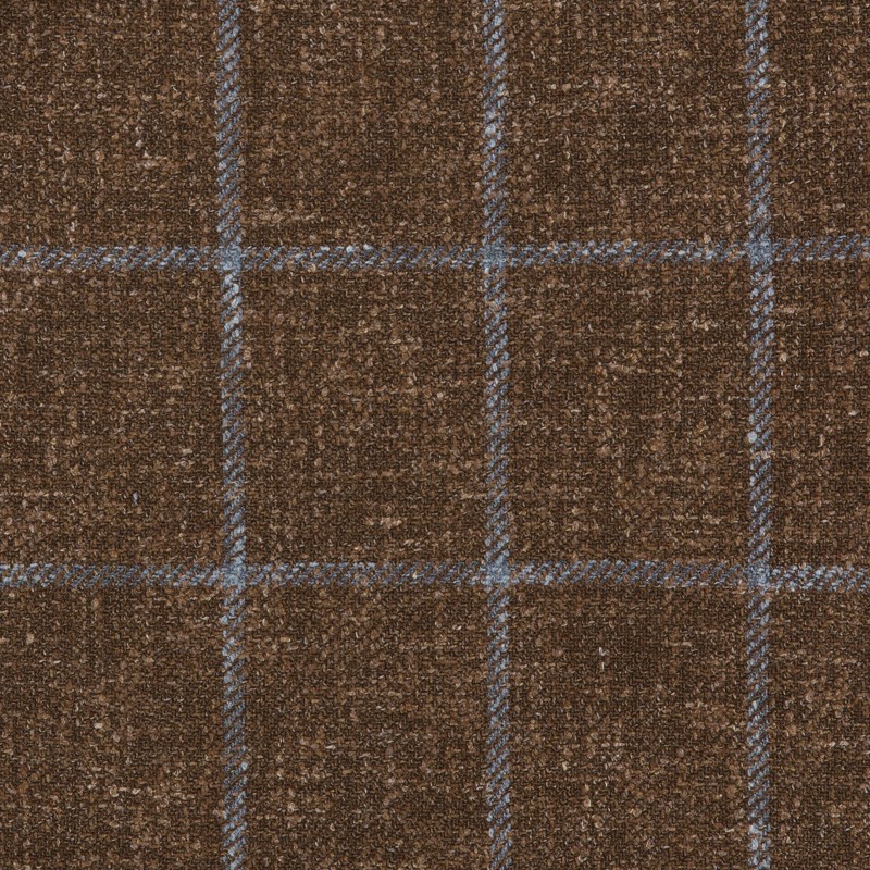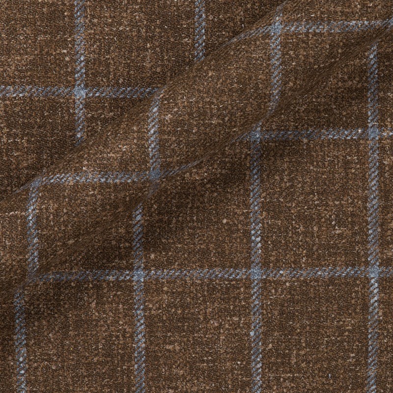 Mixed baby alpaca fabric, check design, light blue on a burnt background, for a three-dimensional effect on the garment.
