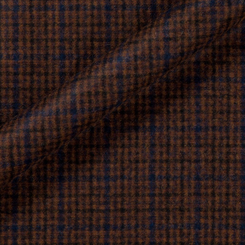 Mixed baby alpaca fabric, damier design, in shades of burnt and blue, ideal for a jacket that expresses an urban spirit.