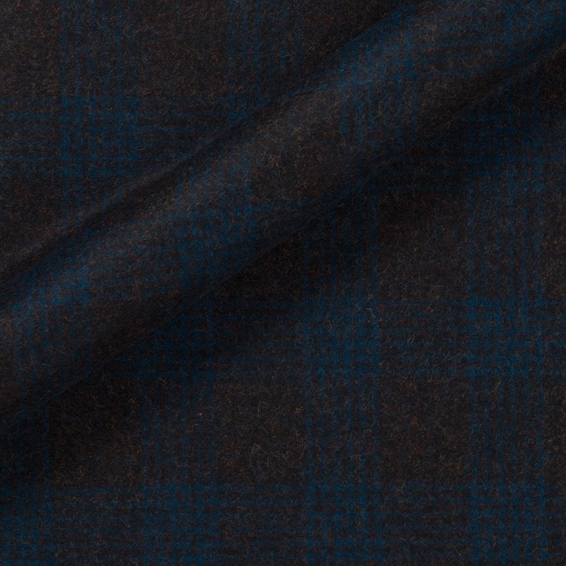 Mixed baby alpaca fabric, check design, teal and brown colors, for a jacket with a contemporary and urban style.