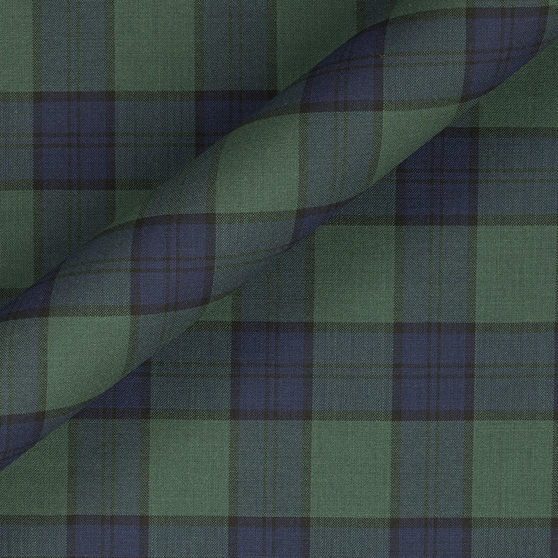 Fancy fabric,in pure wool,made with highly twisted yarns.In shades of blu and green.Fabric guarantees natural crease-resistance,perfect for tailoring suits of the highest quality,in perfect dandy business travel style.