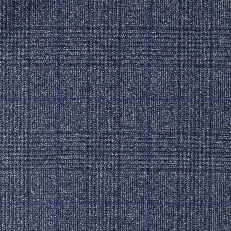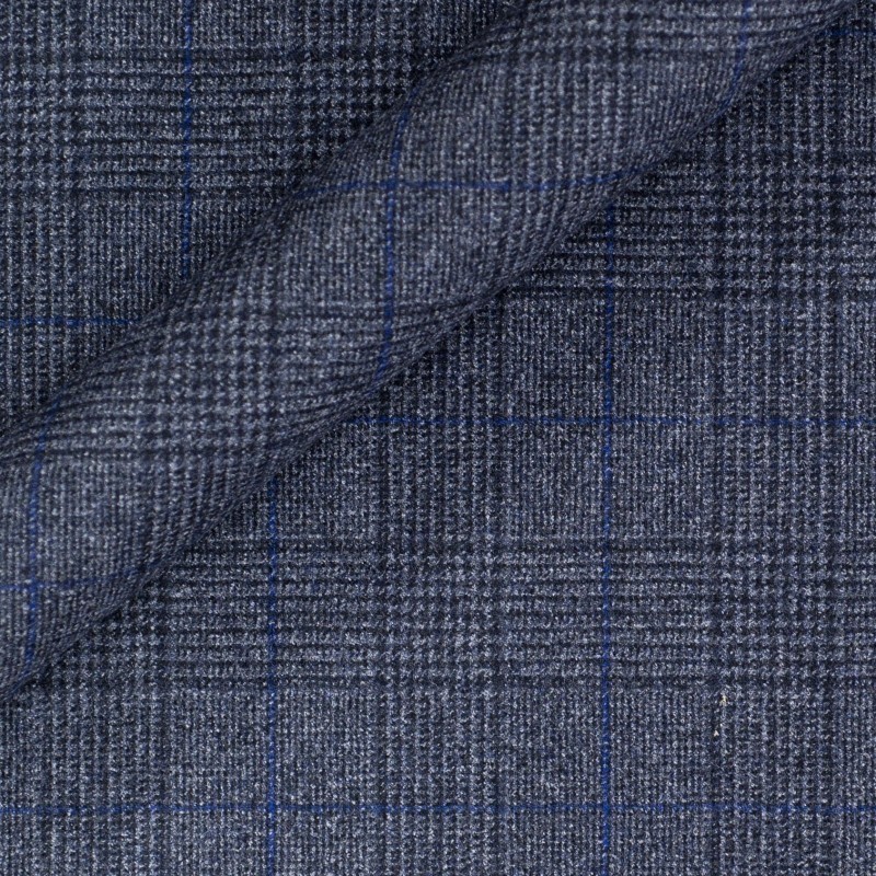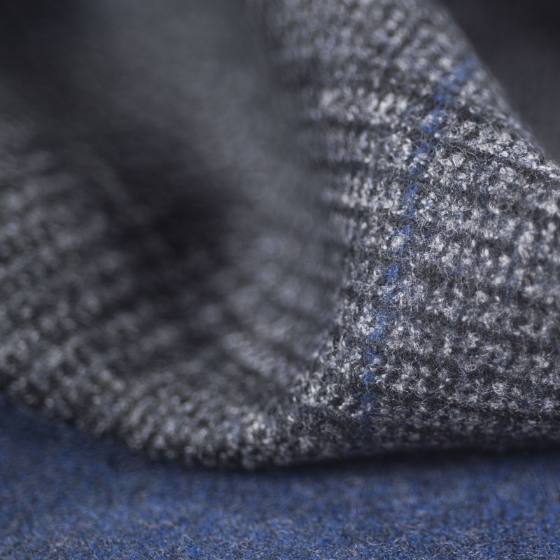 Fabric double-side Prince of Wales in pure virgin wool super 130'S with black and blue check on dark grey ground on front side and blue on back side. This kind of fabric is perfect to create a tailored coat.