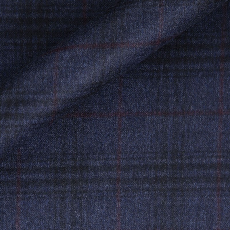 Fabric double-side overcheck in pure virgin wool super 130'S black and red check on blue ground on front side and bordeaux on back side. This kind of fabric is perfect to create a tailored coat.