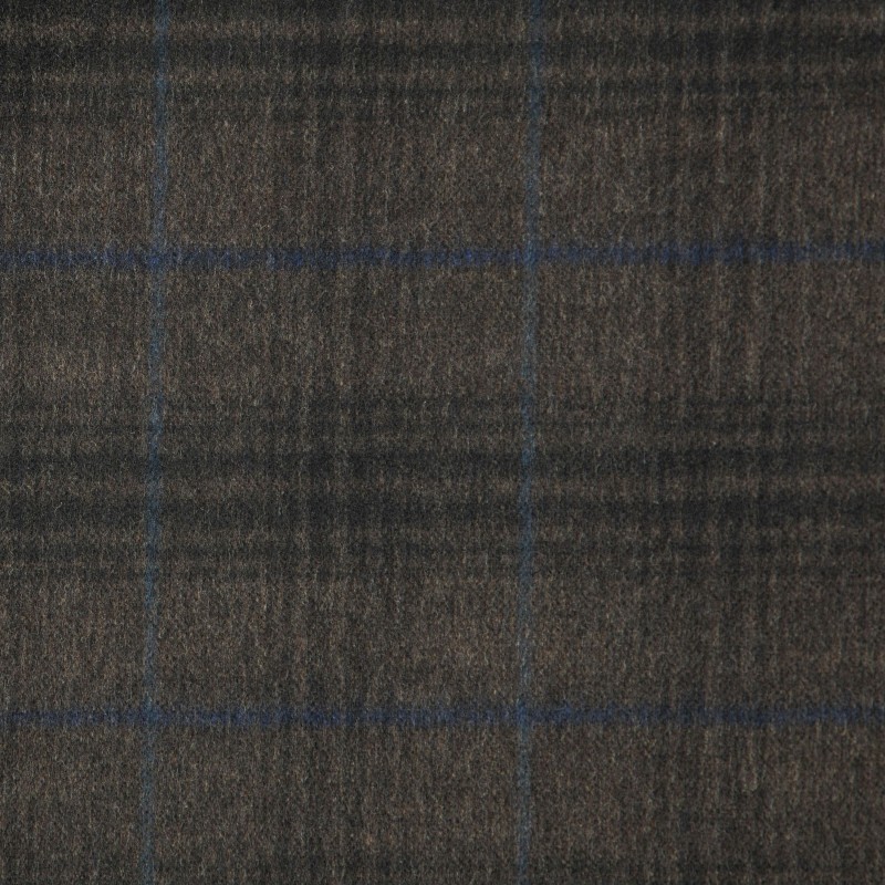 Fabric double-side overcheck in pure virgin wool super 130'S black and green check on brown ground on front side and blue on back side. This kind of fabric is perfect to create a tailored coat.