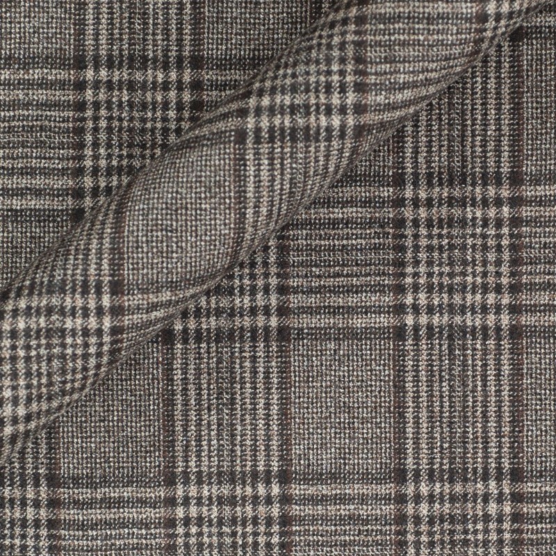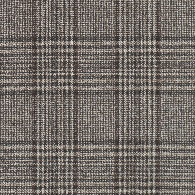 Fabric double-side overcheck in pure virgin wool super 130'S dark brown check on beige ground on front side and dark brown chevron on back side. This kind of fabric is perfect to create a tailored coat.