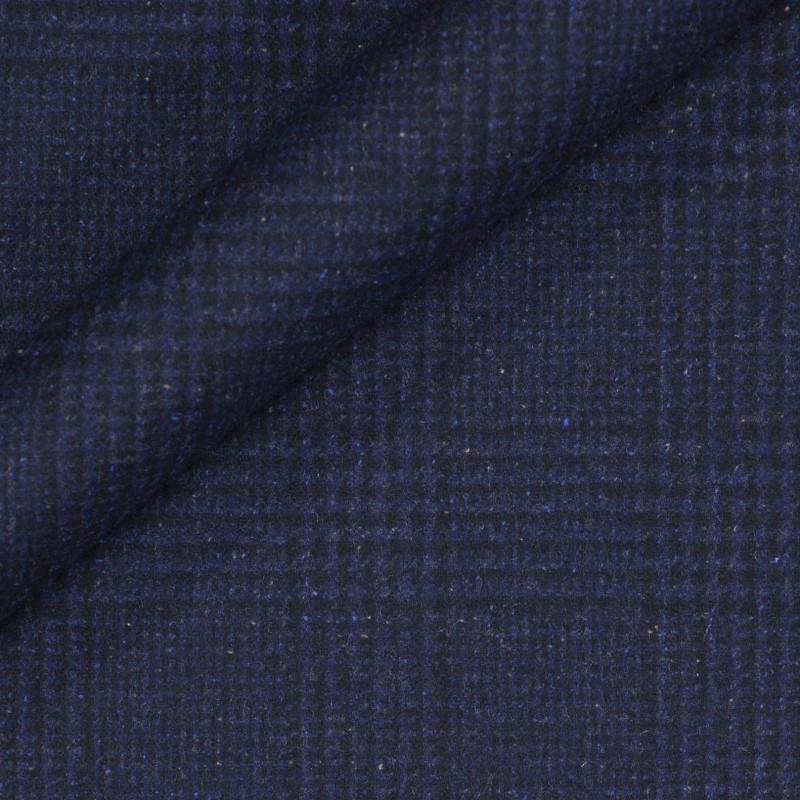 Fabric Prince of Wales in pure wool, polyamide, silk and cashmere, blue check on blue ground. This kind of fabric is perfect to create a tailored coat.