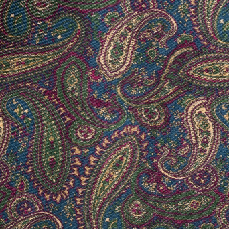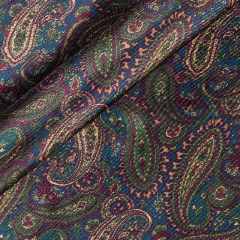 Printed lining in viscose twill, Carnet, with paisley design, in blue, bordeaux and green tones. Fabric suitable to customize the inside of the jacket.