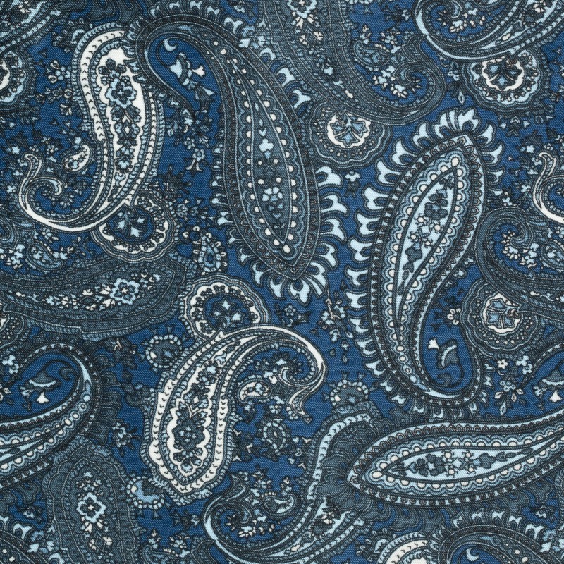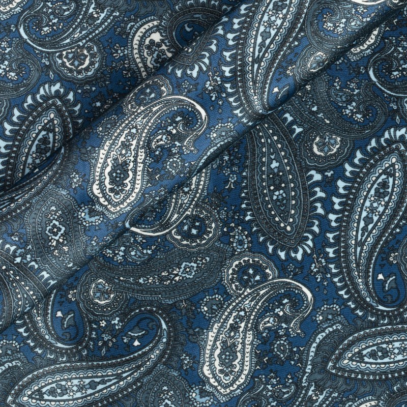 Printed lining in viscose twill, Carnet, with paisley design, in blue, light blue and ivory tones. Fabric suitable to customize the inside of the jacket.