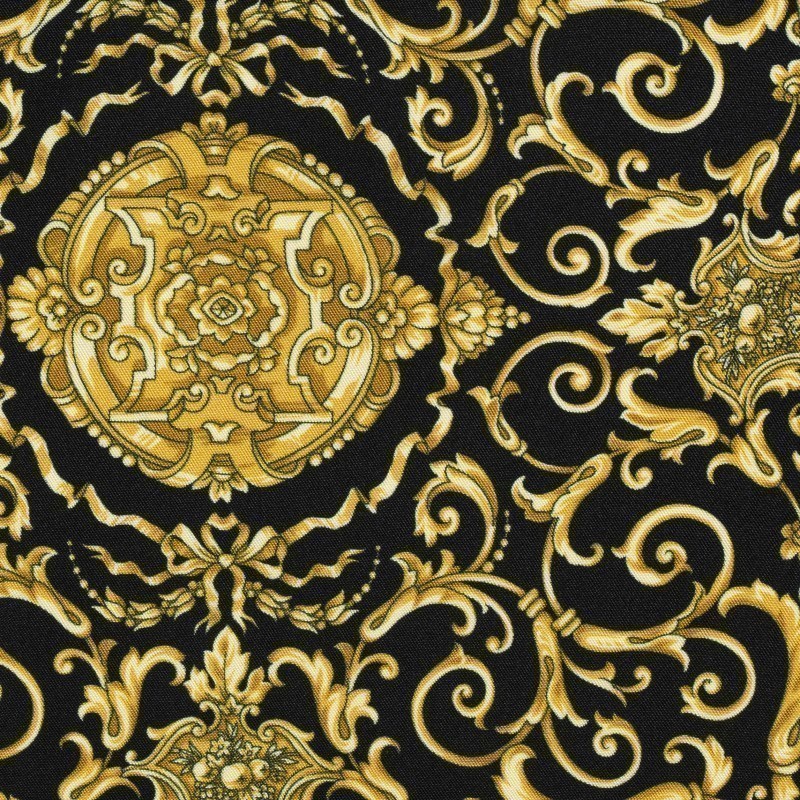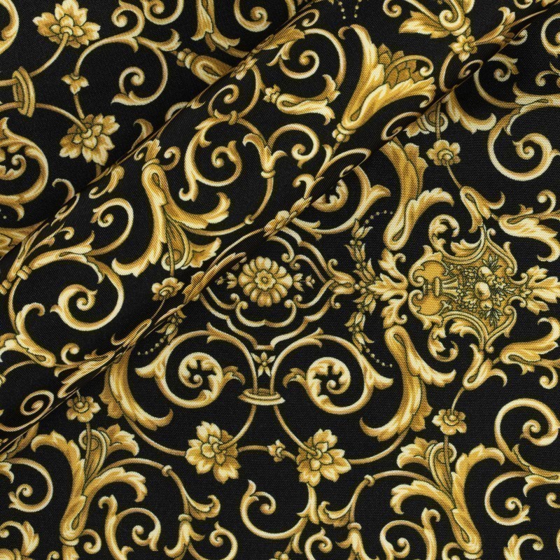 Printed lining in viscose twill, Carnet, with ornamental design, in elegant black and gold. Fabric suitable to customize the inside of the jacket.