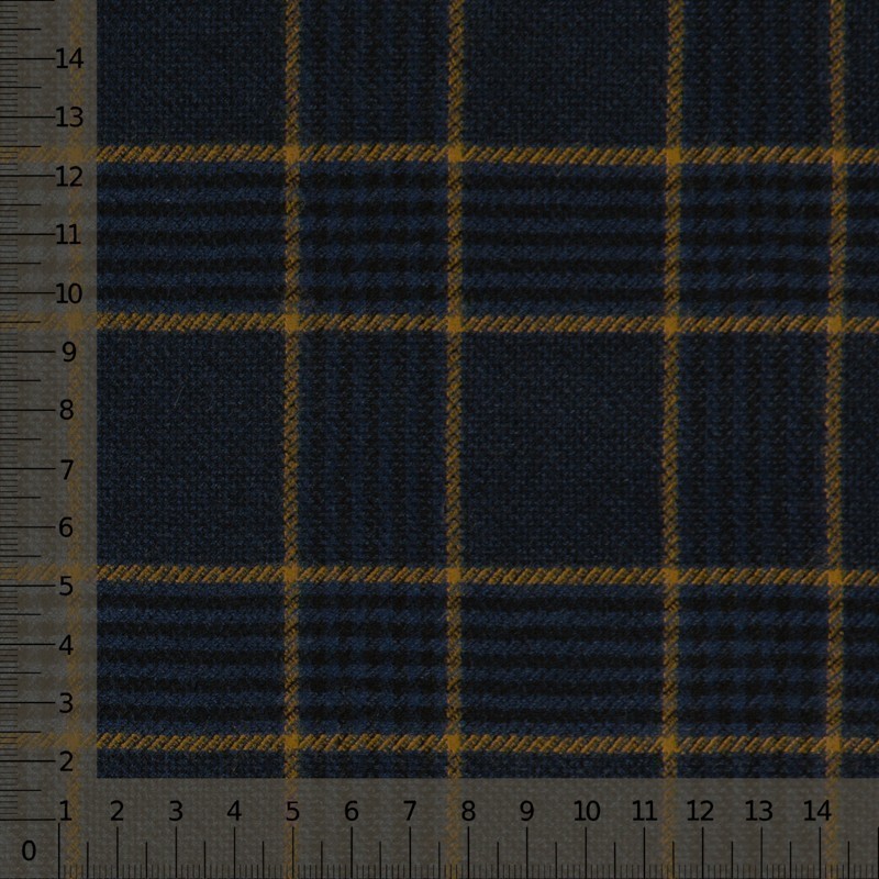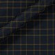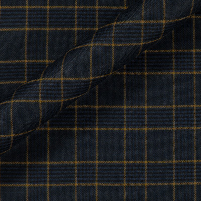 Tessuto flanella di lana stretch, galles blu/nero con check giallo, per un abito che trasforma, con verve, anche l'appuntamento più formale.