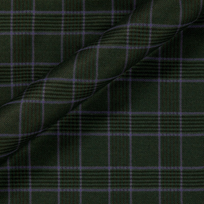 Tessuto flanella di lana stretch, galles verde con check viola, per la confezione di un abito che accentua la versatilità anche del più classico dei capi.