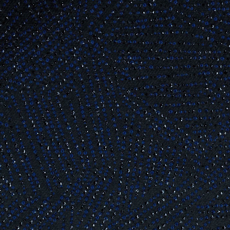 Tessuto jacquard lamé con disegno geometrico, nei toni nero e blu. Questo tessuto è consigliato per confezionare giacche sartoriali per eventi esclusivi.
