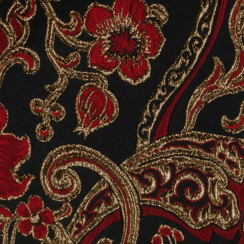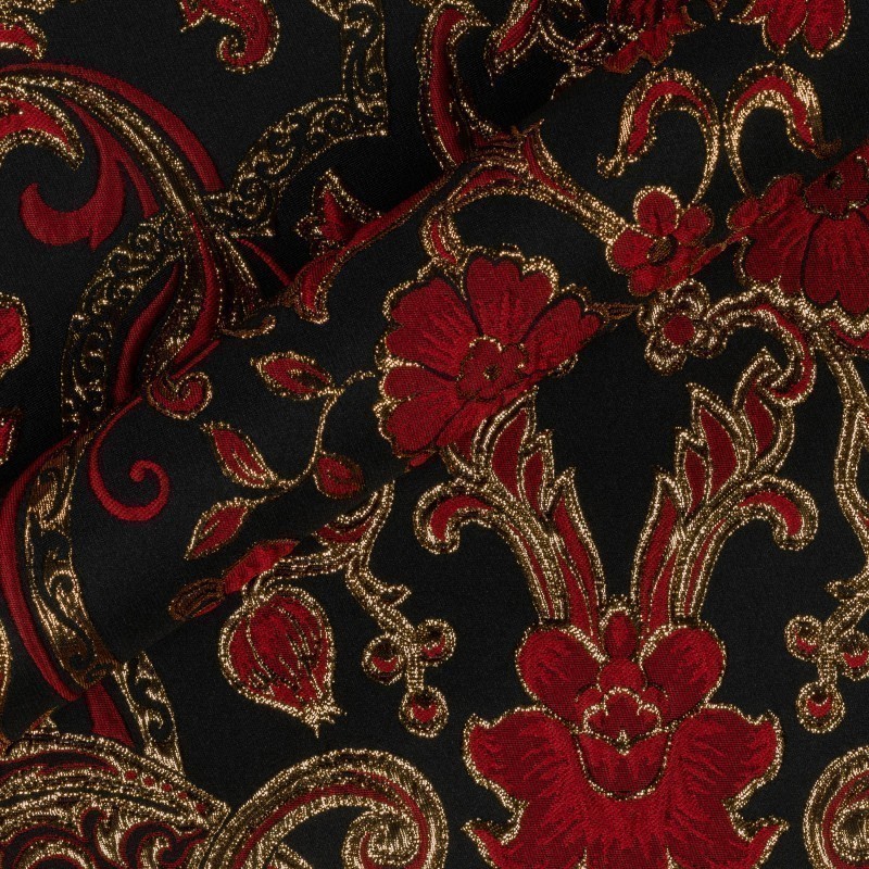 Tessuto jacquard matelassé con disegno floreale, nei toni nero, rosso e oro. Questo tessuto è consigliato per confezionare giacche sartoriali per eventi esclusivi.