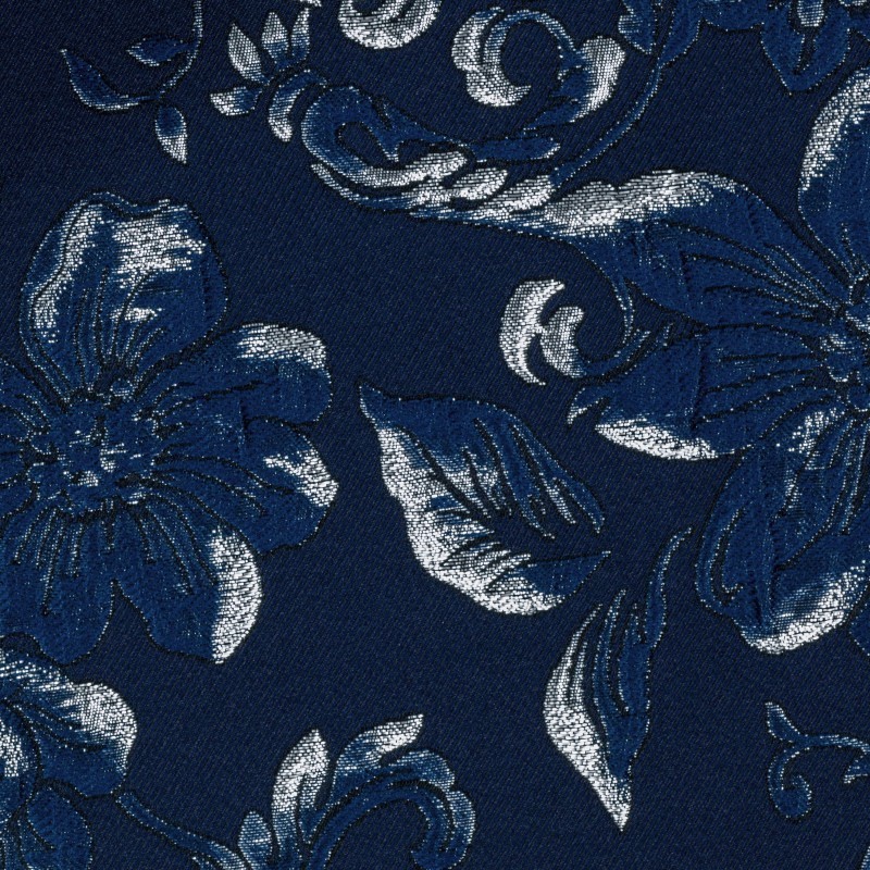 Tessuto jacquard matelassé con disegno floreale, nei toni blu e silver. Questo tessuto è consigliato per confezionare giacche sartoriali per eventi esclusivi.