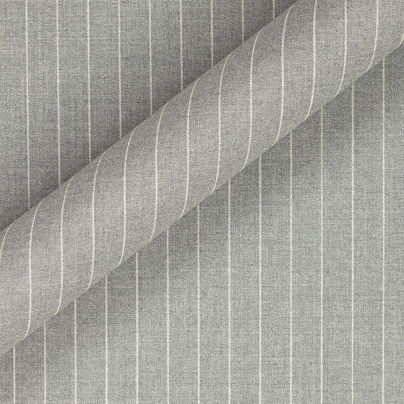 Tessuto fantasia,in pura lana, realizzato con filati ritorti ad alte torsioni. Nei toni del grigio melange e riga bianca Garantisce una naturale resistenza alla piega, perfetto per confezionare capi sartoriali, dandy business travel, della massima qualità
