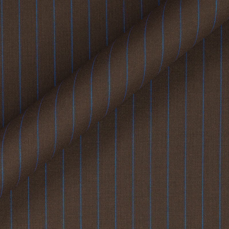 Tessuto fantasia, in pura lana, realizzato con filati ritorti ad alte torsioni. Nei toni del marrone e riga azzurra. Garantisce una naturale resistenza alla piega, perfetto per confezionare capi sartoriali, dandy business travel, della massima qualità.