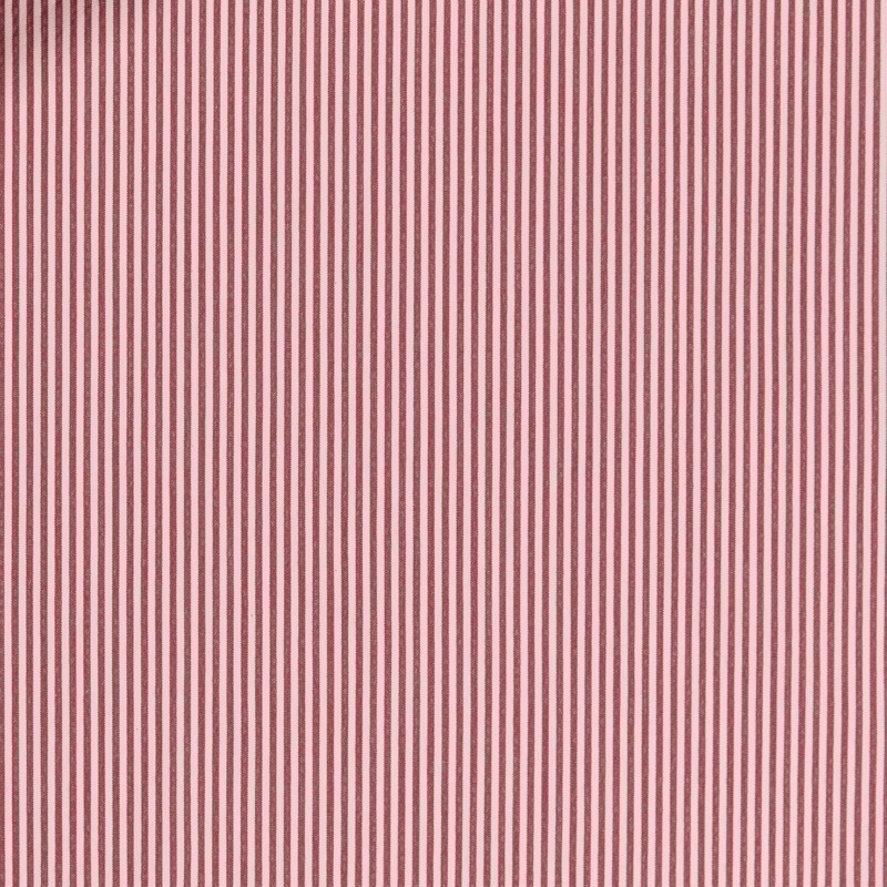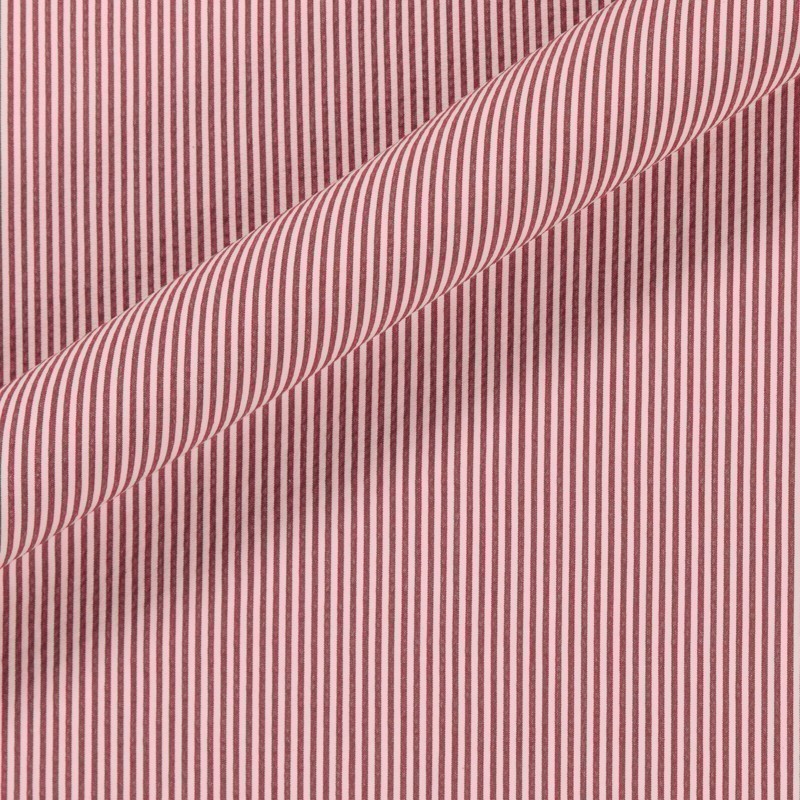 Tessuto seersucker, di cotone stretch, fantasia bacchettino bianco e rosso, per la confezione di un abito che denota una particolare raffinatezza e gusto.