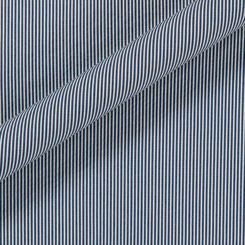 Tessuto seersucker, di cotone stretch, fantasia bacchettino bianco e blu, per la creazione di un abito o una giacca, versione leggera e morbida di un classico della sartoria.