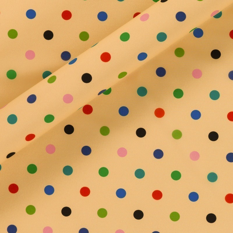 Tessuto in seta stretch Ungaro collection SS25 con disegno pois multicolor adatti per camicie moderne.