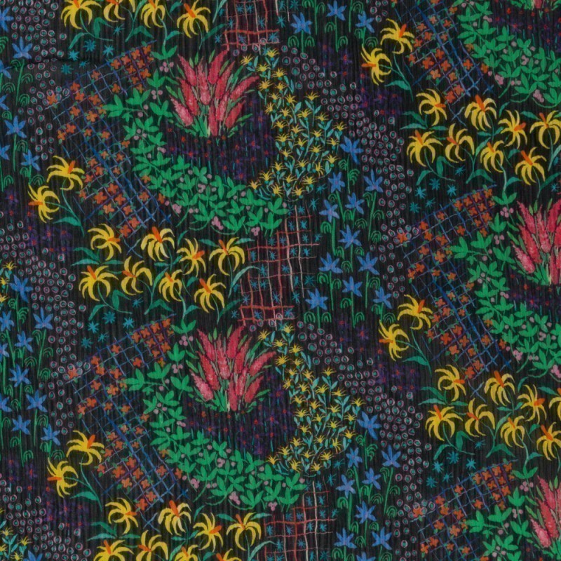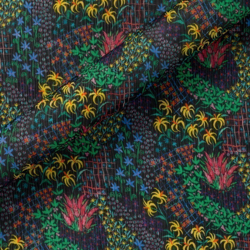 Tessuto in creponne cotone seta ungaro collection SS25 con disegno fantasia floreale multicolor, adatto per blouse leggere e romantiche.